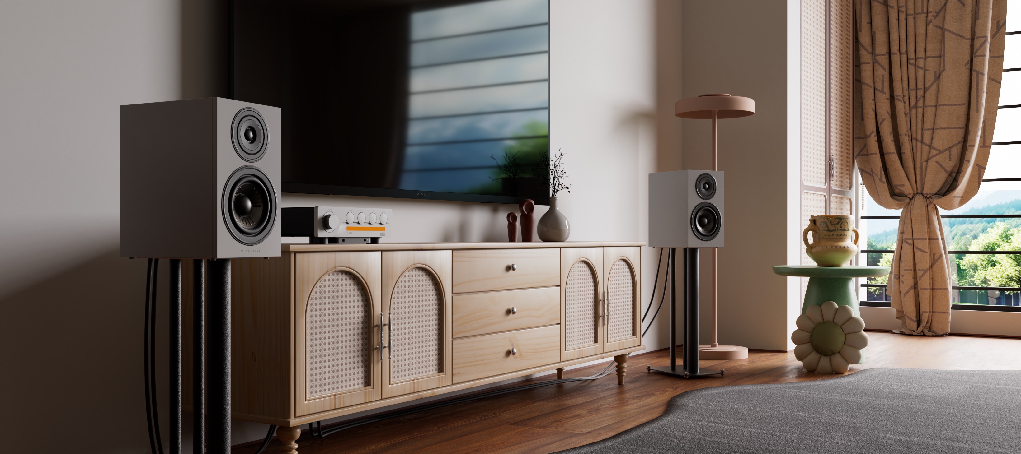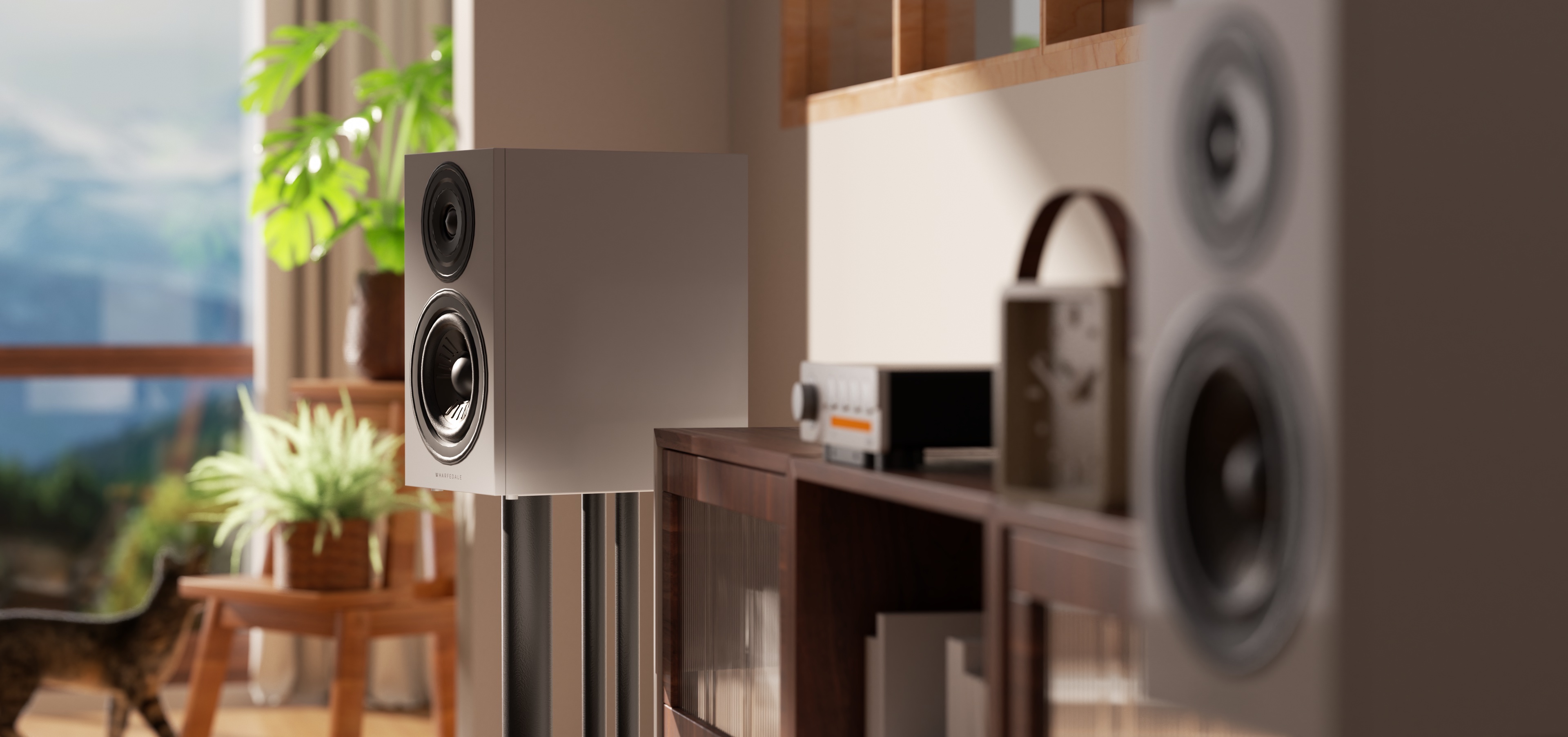 Lintons with stands (walnut finish, lifestyle shot)
